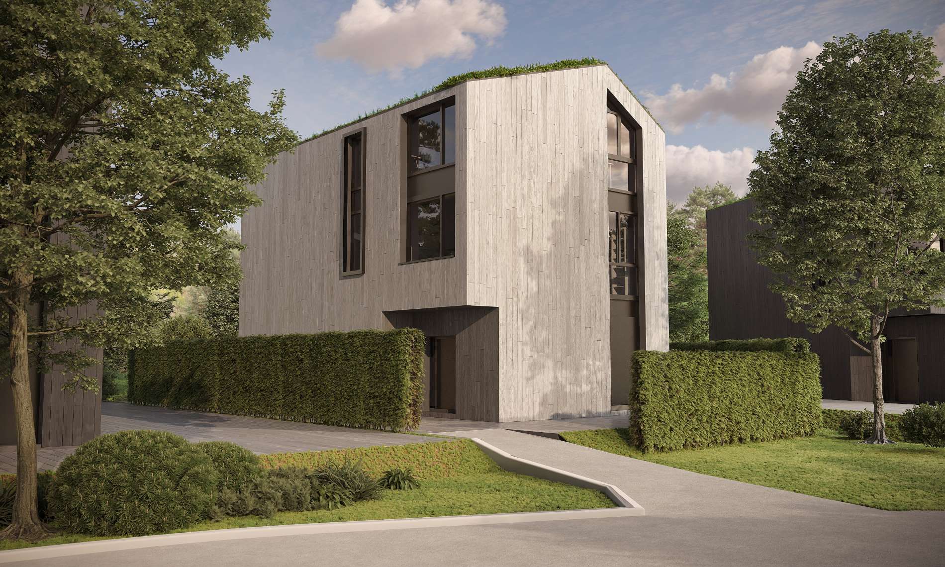 Een belangrijk uitgangspunt binnen dit project was dat de woningen zorgvuldig moesten worden ingepast in het omliggende bosgebied. Dit is vertaald naar een passend bouwvolume, een duidelijke architectonische hoofdvorm en een materialisatie die aansluit bij de natuurlijke omgeving, in lijn met het beeldkwaliteitsplan en het kavelpaspoort.
